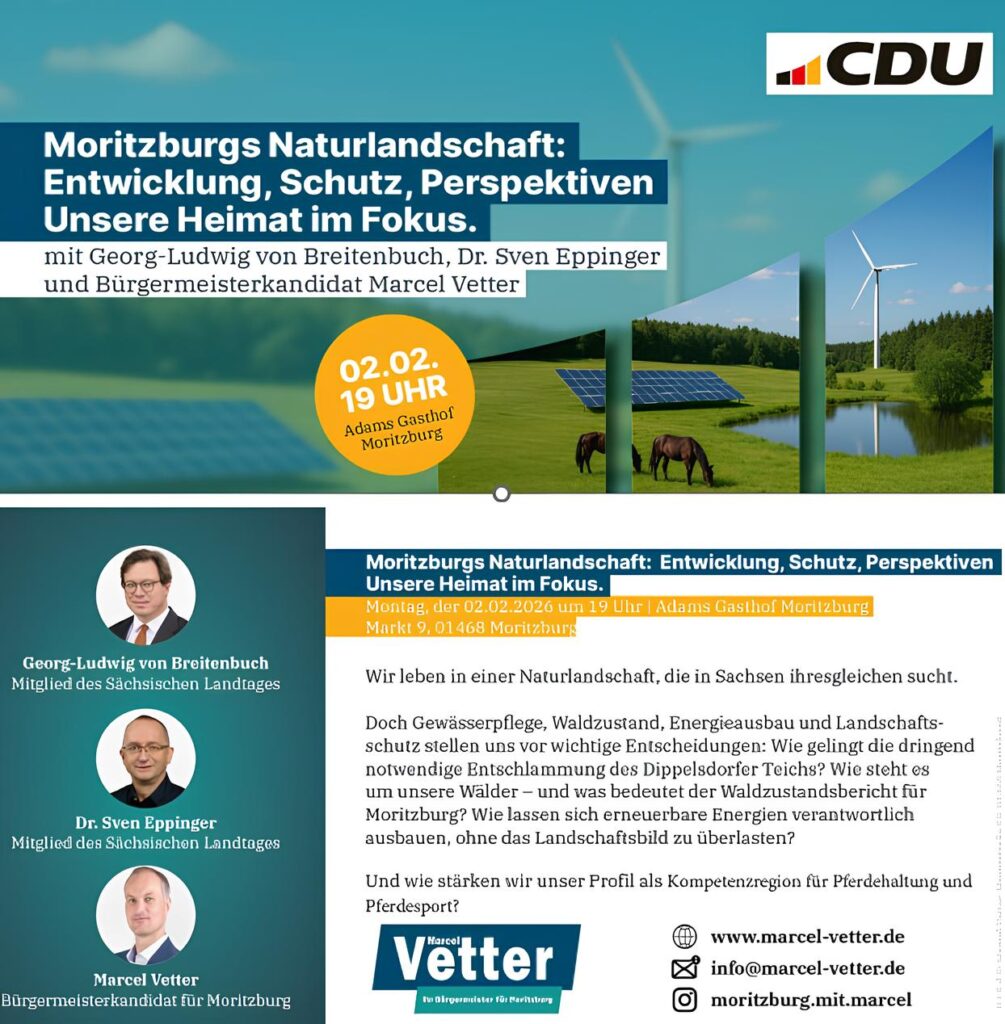 Moritzburg ist unsere Heimat und Lebensraum zugleich. Ich möchte unsere Gemeinde als modernen, lebenswerten und wirtschaftlich zukunftsfähigen Standort weiterentwickeln – ohne Zersiedelung und mit dem klaren Ziel, den besonderen Charakter unserer Ortsteile zu bewahren.