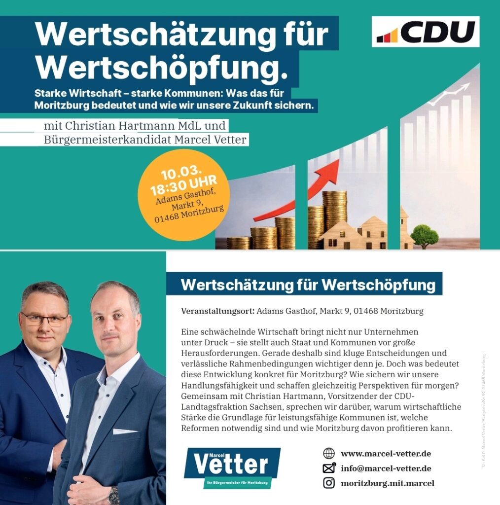 Ich setze auf einen gezielten Einsatz finanzieller Mittel: Jede Investition soll klare Vorteile für Moritzburg und ihre Bürgerinnen und Bürger bringen. Gleichzeitig möchte ich Fördermittel aktiv einwerben, um die Investitionskraft der Gemeinde zu erhöhen.